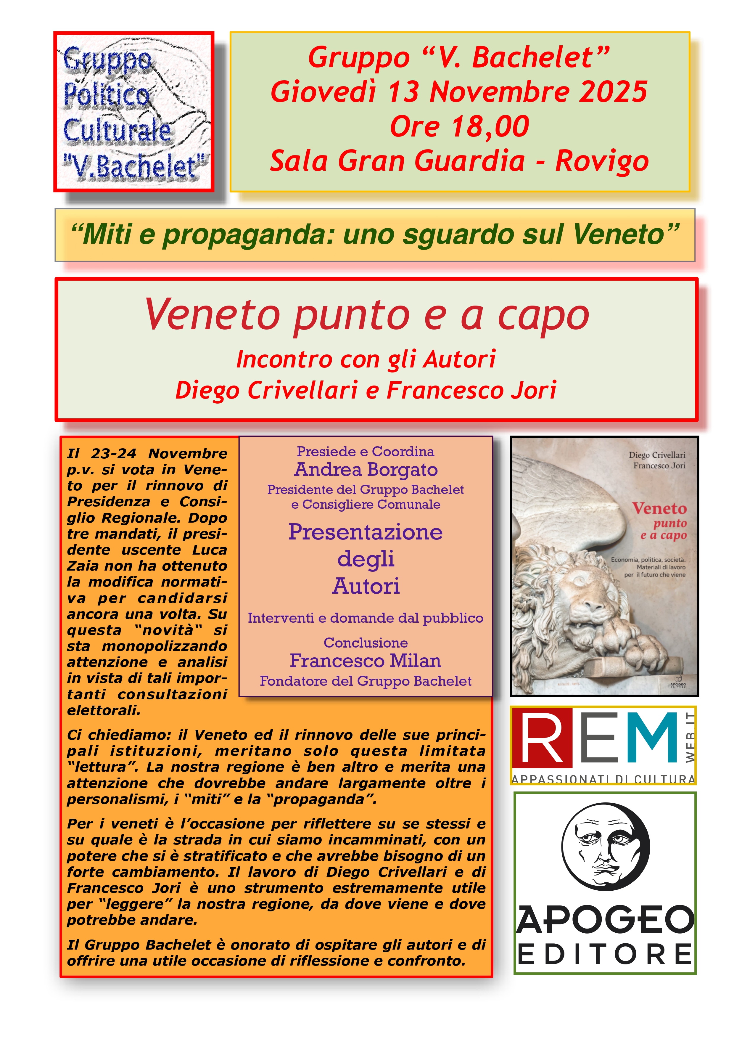 Le prime due presentazioni del libro saranno a Rovigo, sala della Gran Guardia, giovedì 13 novembre alle 18.00 (con il Gruppo Bachelet di Rovigo) e a Padova, sede della Confcommercio regionale, lunedì 17 novembre alle ore 17.00